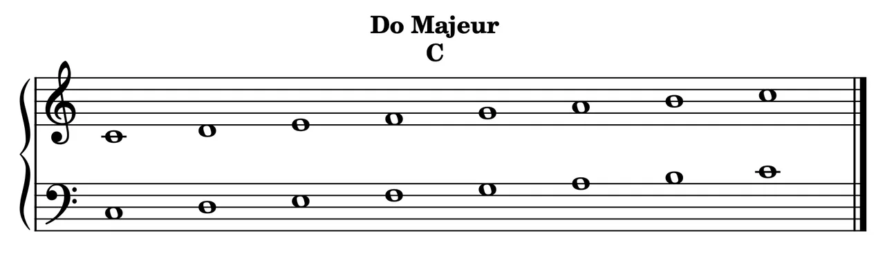 In C major, no note is altered. That is, there are no flats or sharps to play: all notes are played without alteration. The C major scale is very often the first scale learned and used when starting out in music. Here it is written in treble clef and bass clef below, along with a recording of this C major scale played on the piano.