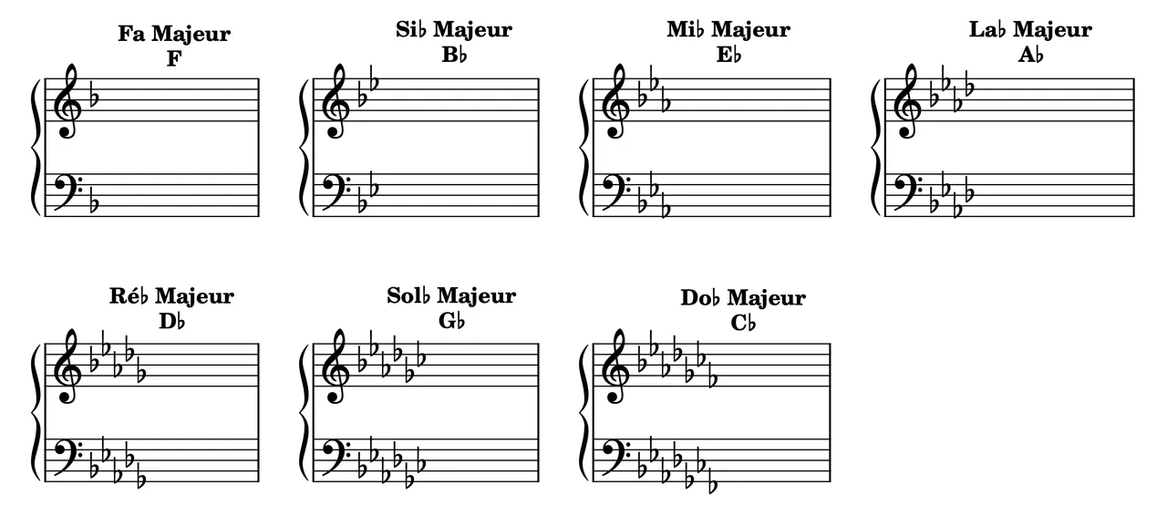 Flats, like sharps, also appear in a specific order: B♭, E♭, A♭, D♭, G♭, C♭, F♭. Each new flat added changes the key.