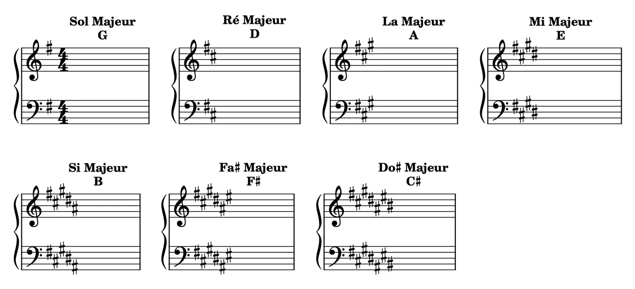 Sharps appear in a specific order: F♯, C♯, G♯, D♯, A♯, E♯, B♯. Each new sharp added changes the key.